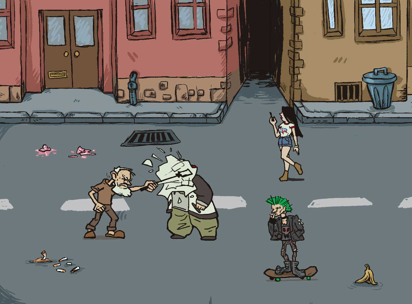 Dieses digitale Spiel entstand im Rahmen des 3. HAW GameJams innnerhalb von 48 Stunden (inklusive Schlaf). So sind zwar simple, aber zweckmäßige Character und Animationen entstanden. Zum Thema des Jams, "Juvenoia", die Angst der älteren Generation, dass die jüngere Generation verkommt, haben wir im vierköpfigen Team aus 2 Grafikerinnen und 2 Programmierern ein kurzweiliges Spiel über einen alten Mann, der stereotype Jugendliche mit einem Selfiestick verprügelt, geschaffen. Characterdesign, Angriff- und Walkcycle-Animationen sind von mir. Außerdem habe ich ein Introvideo animiert, welches hier zu sehen ist: Link. Hintergrund- und UI-Grafik von Svenja Kohlmann.