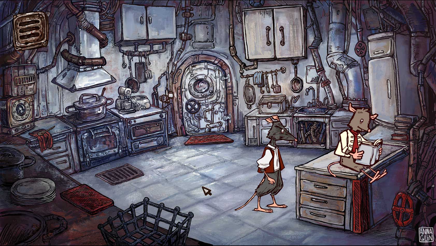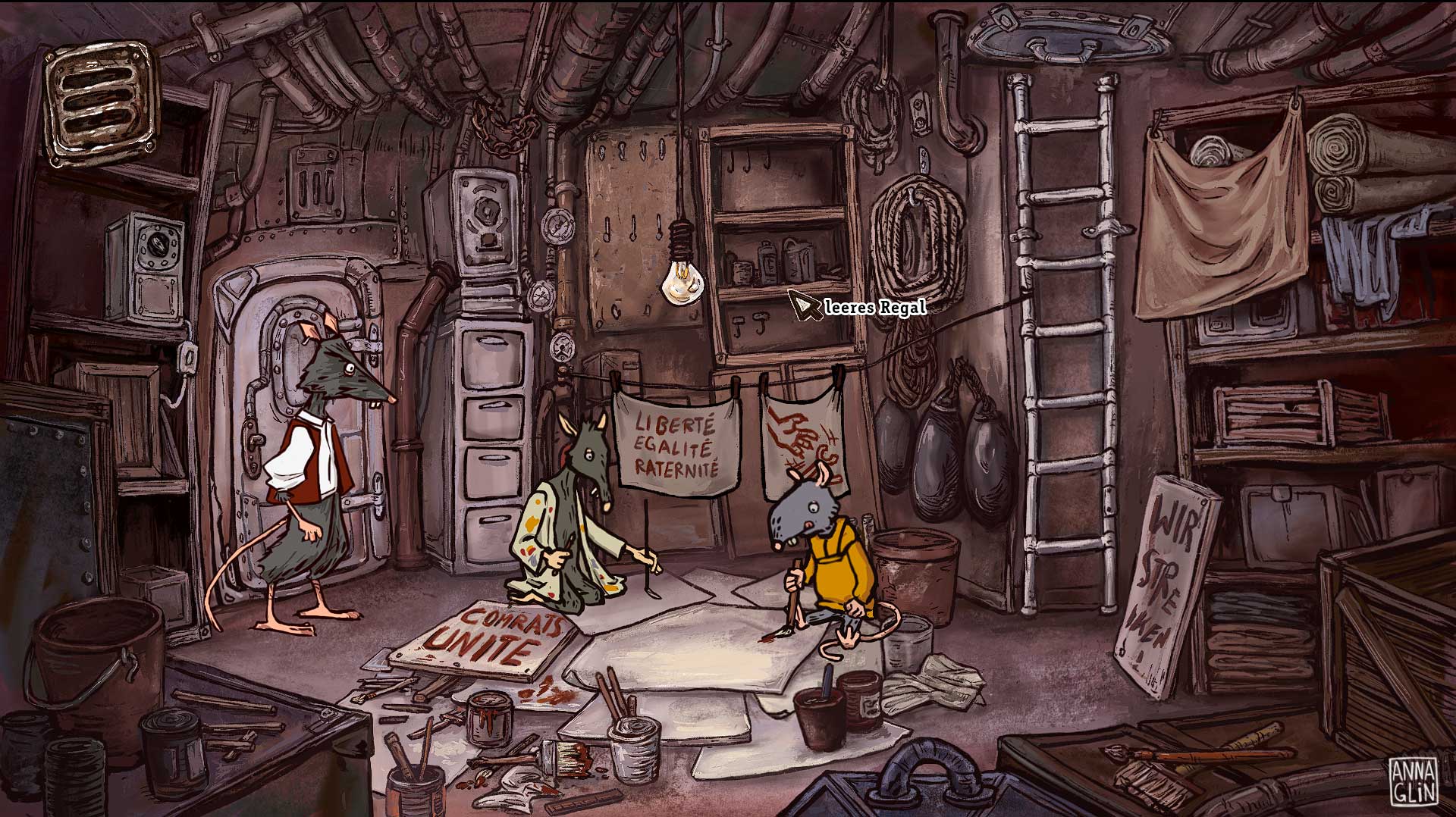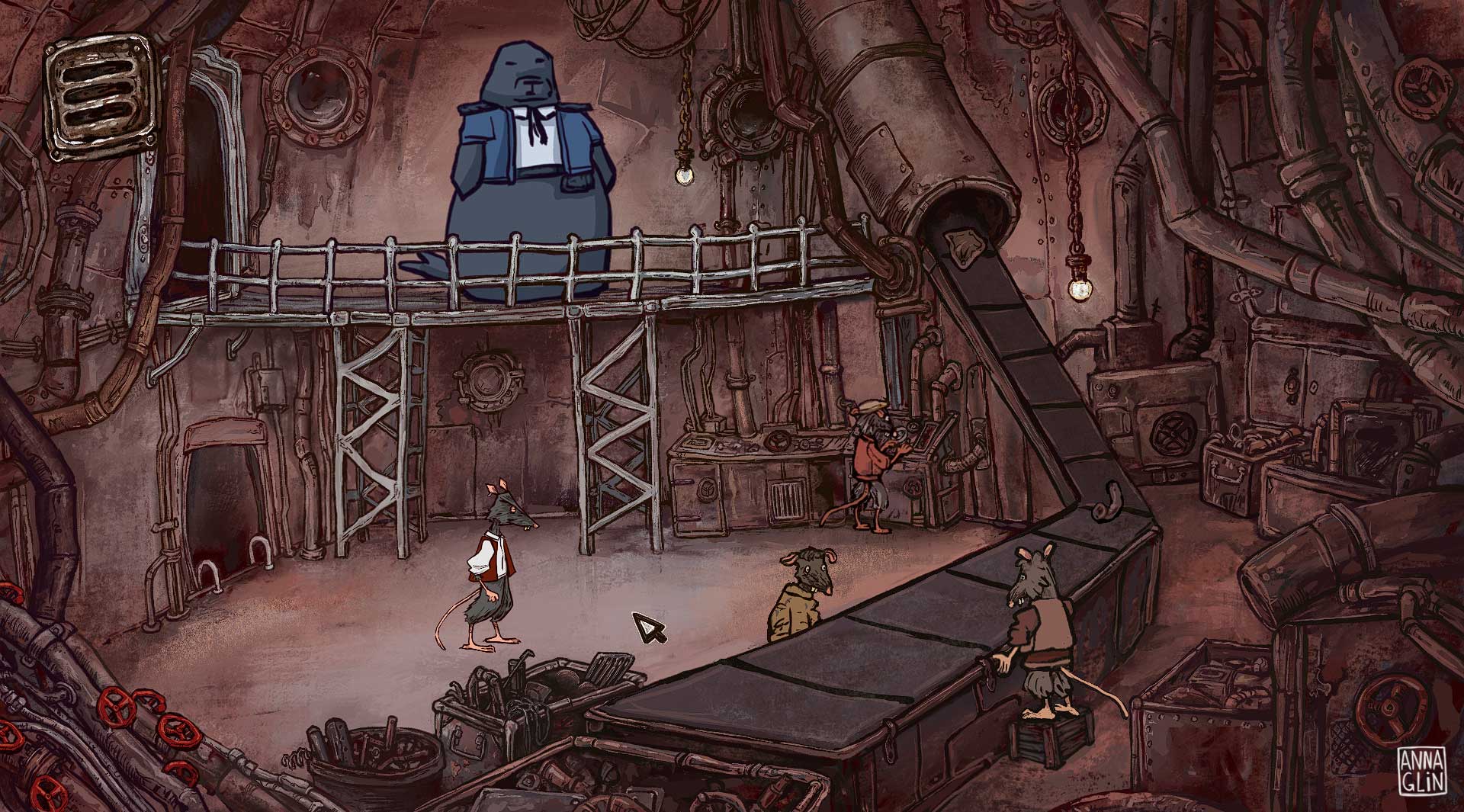 Das klassische Point and Click Adventure handelt von Ratten auf einem Schiff, die versehentlich einen Arbeiteraufstand starten. Einen Ausschnitt der Geschichte habe ich im Rahmen meiner Bachelorarbeit umgesetzt und komplett mit Hintergründen, Character Designs, Animationen und UI inszeniert.